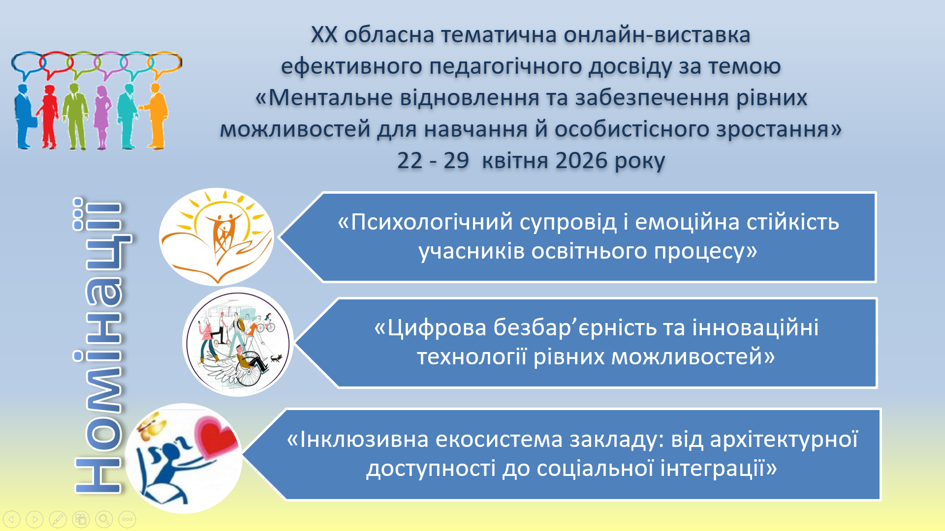 Номінації ХХ виставки: «Психологічний супровід і емоційна стійкість учасників освітнього процесу»; «Цифрова безбар’єрність та інноваційні технології рівних можливостей»; «Інклюзивна екосистема закладу: від архітектурної доступності до соціальної інтеграції».